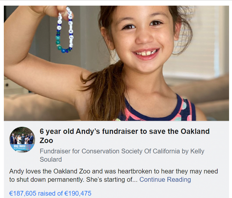Ένα κοριτσάκι από την Καλιφόρνια έλαβε δράση με θεαματικά αποτελέσματα, όταν έμαθε πως ο αγαπημένος της ζωολογικός κήπος ετοιμάζεται να κλείσει λόγω οικονομικών προβλημάτων που προκάλεσε η πανδημία. Έτσι, δημιούργησε έρανο στο Facebook, με αποτέλεσμα να συγκεντρώσει 200.000 δολάρια!