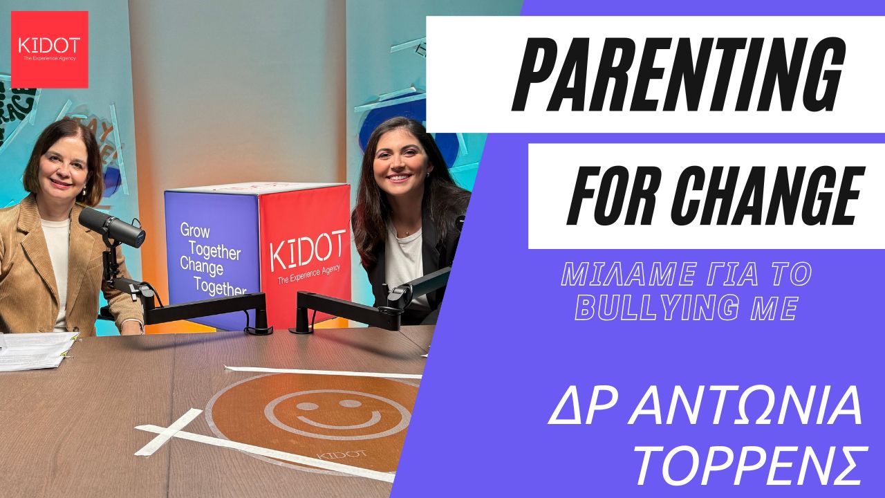 Στο πρώτο επεισόδιο της νέας σειράς podcast & vidcast “Parenting for Change”, συζητάμε τη θεματική του Bullying με καλεσμένη την Δρ. Αντωνία Τορρένς, Εκπαιδευτική ψυχολόγο, Γενική διευθύντρια του ΚΜΟΠ – Κέντρου Κοινωνικής Δράσης και Καινοτομίας – από το 1977 έως και σήμερα και αντιπρόεδρο της Συνομοσπονδίας Οικογενειακών Οργανώσεων της Ευρώπης. Η Δόκτωρ Τορρένς, έχει επίσης δημιουργήσει και είναι υπεύθυνη για το πρόγραμμα Live Without Bullying «Ζήσε Χωρίς Εκφοβισμό», ένα καινοτόμο πρόγραμμα πρόληψης και αντιμετώπισης του σχολικού και διαδικτυακού εκφοβισμού.